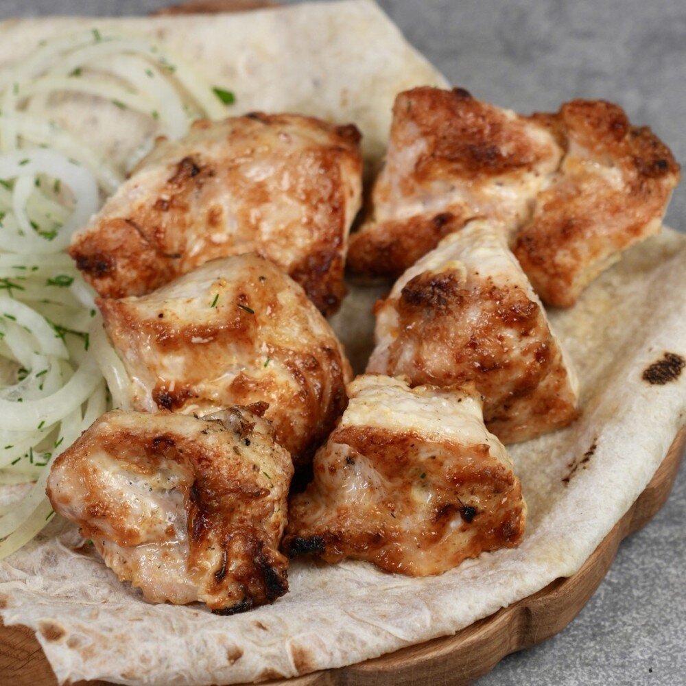 Ищете идеальный ужин? Попробуйте наш шашлык из куриной грудки! Нежное мясо, маринованное с паприкой, майонезом, солью и тимьяном, приготовленное на гриле до сочности. Подаётся с ароматным лучком
